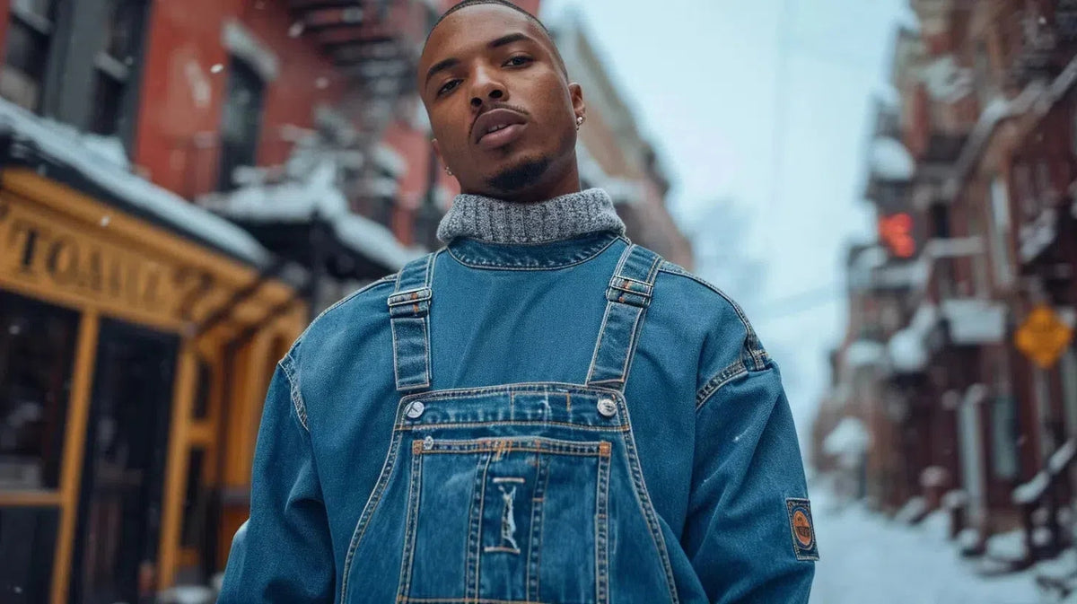 Male celebrity in long sleeve denim overalls, white tee, outdoor urban backdrop, ethnicity-inspired setting. Late Winter  season.
